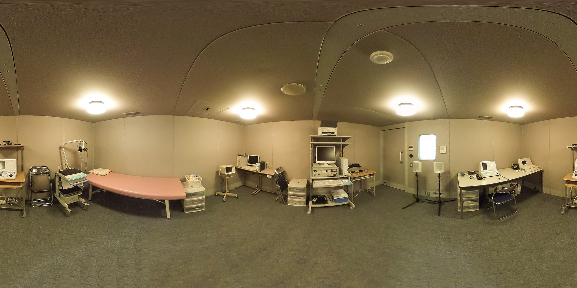 主に聴覚検査演習を行う教室です。聴力検査には純音聴力検査の他、聴性脳幹反応という脳波から聴力を推定する機器や乳幼児聴力検査(0ヶ月から検査可能)の機材も揃えております。シールドルームは防音だけでなく、外部からの電場や磁場の影響を受けない部屋で脳波測定のために設置されています。