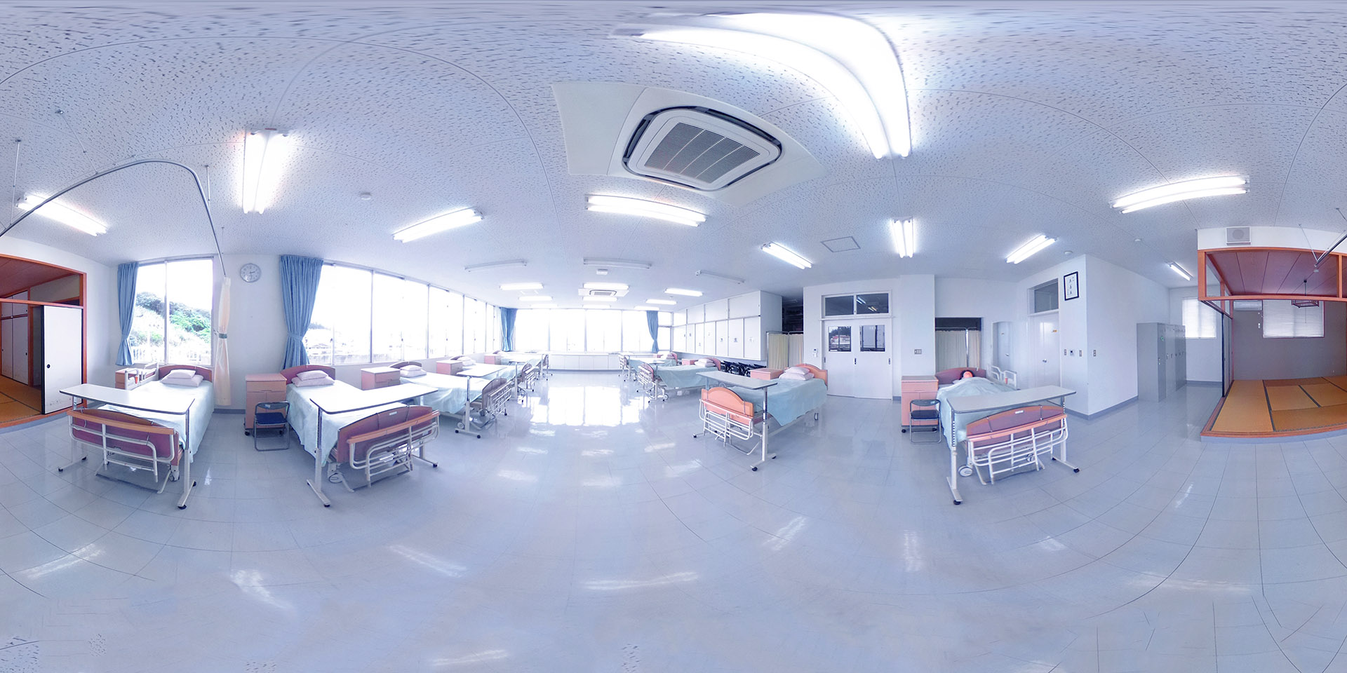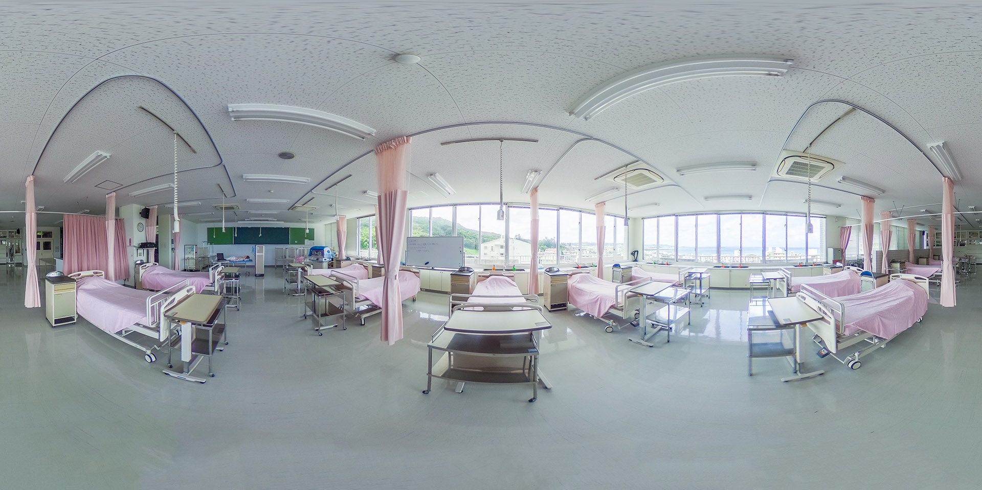 介護技術の演習をする教室です。ベッドメイキングや車椅子移動、排泄介助、全身清拭、食事介助など、技術の習得だけでなく、相手に合わせた声掛けのしかたなど、日常生活で必要な全ての技術をここで実践します。